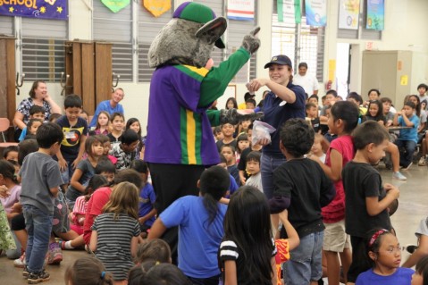 Jackie Dulatre from Chuck E. Cheese Restaurant located in the Pearl City Shopping Center, brought along Chuck E. Cheese, in person, much to the delight of the entire student body. They screamed out his name chanting, “Chuck E. Cheese” as the iconic mascot made his way around the cafeteria shaking hands with students from kindergarten through the sixth grade.