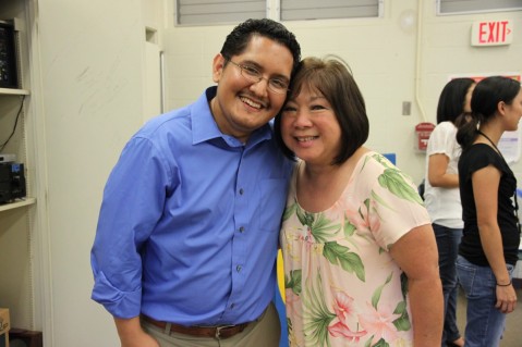 George Cochard presents Palisades Elementary School Principal Suzanne Yamada (much to her surprise) with 10 – $100 PCSC gift certificates donated by the Pearl City Shopping Center Merchants Association.