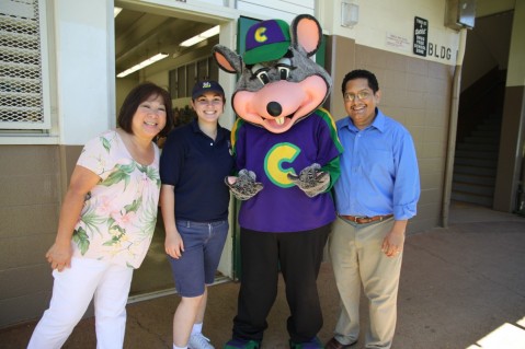 Palisades Elementary School Principal Suzanne Yamada, Jackie Dulatre from Chuck E. Cheese Restaurant, Chuck E. Cheese, and George Cochard from Rolf Advertising representing the Pearl City Shopping Center Merchants Association pose for a photo outside the school cafeteria on Friday, August 10, 2012.