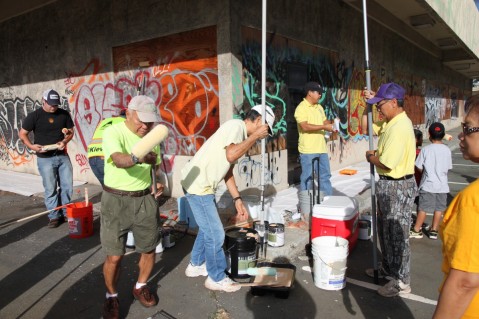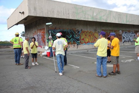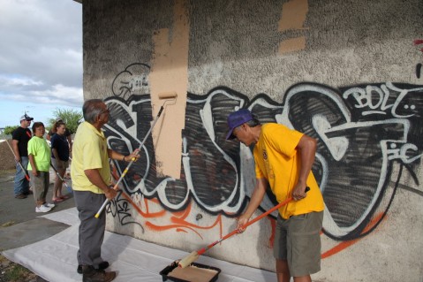 Several Lions clubs volunteers came together on Saturday to work alongside Kiewit personnel to paint over the graffiti that has become quite an eyesore to commuters as they make their way through the Pearlridge Shopping Center area on Kamehameha Highway.