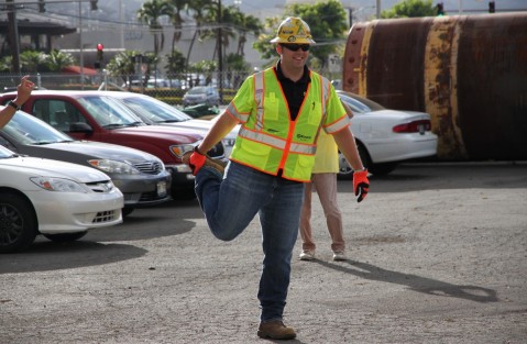 Matt Adams, Kiewit Civil Manager demonstrates proper warm up and stretching exercises to prepare volunteers for the work ahead on Saturday.