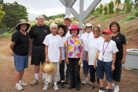 Honolulu Rose Society President Myrna Cariaga (far right) is pictured with Honolulu Rose Society members on Sunday, September 23, 2012 inside the new rose garden pergola that sits on the Peace Garden path that leads to the beautiful and flourishing UGC Rose Garden.