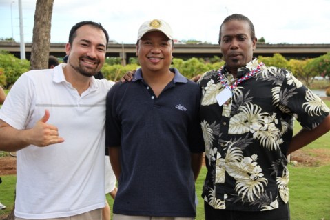 Rotary Club of Pearlridge past president Theo Stiller (left) and current president Tony Lorenzo (center) were recognized on Sunday for the club's community service project efforts that assisted in provided manpower for the creation of the UGC Rose Garden and recently constructed rose garden pergola. Stiller and Lorenzo are also pictured with Eric Butler from WorldPeacePlan.org.