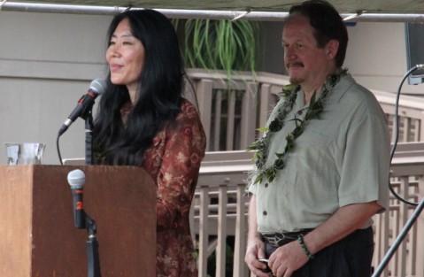 Xiao Fang Zhou along Michael North from the Zhou Enlai Peace Institute speak to attendees in a message of Peace and Aloha after receiving an award from the UH CTAHR Urban Garden Center for their efforts in supporting peace.