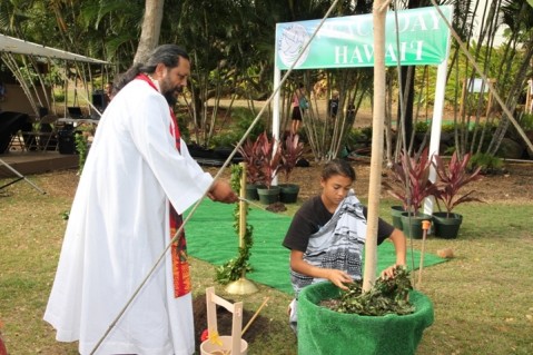 Kahu Kaleo Patterson from the Peace & Justice Reconciliation Center and Kaya Kamakau'i Patterson perform a blessing for a beautiful Bodhi Tree that will grace the entrance to the Pearl City Peace Garden.