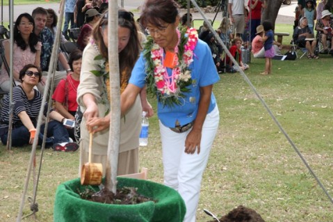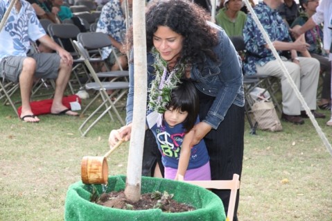 Maya Soetoro-Ng and her daughter participate together in the blessing of the Peace Garden Bodhi Tree on Sunday at the UH CTAHR Pearl City Urban Garden Center.