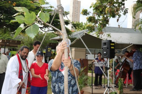 Kahu Kaleo Patterson from the Peace & Justice Reconciliation Center performed a blessing for a beautiful Bodhi Tree that will grace the entrance to the Pearl City Peace Garden.