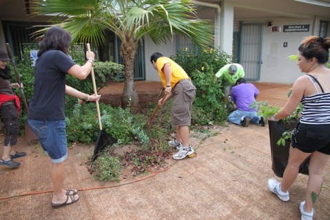 Waiau Elementary School held their Adopt-A-School Day Campus Clean Up on Saturday, September 29, 2012. Volunteers representing several community groups and organizations, Pearl City High School staff and students, as well as Waiau Elementary School staff, parents, and students came together to spruce up and beautify the campus grounds in front of the school.