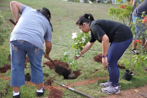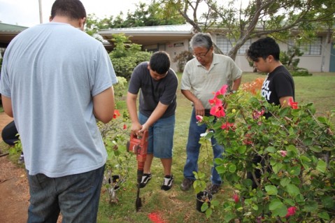 Bert Nakashima from Pearl City High School works with PCHS students as they drill holes before planting several new Hibiscus plants in front of the school.