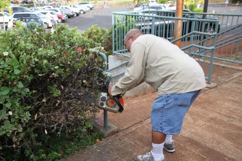 Pearl City Community Association Board Member and community coordinator for the Waiau Elementary School Adopt A School Day Clean Up. Leroy Ching takes out a chain saw to trim back a hedge near the school entrance.