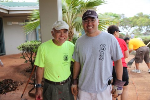 Pearl City Community Association Board Members Molina Gomez and Calvin Ebesutani take break while volunteering on Saturday, September 28, 2012 at Waiau Elementary School during Adopt A School Day.