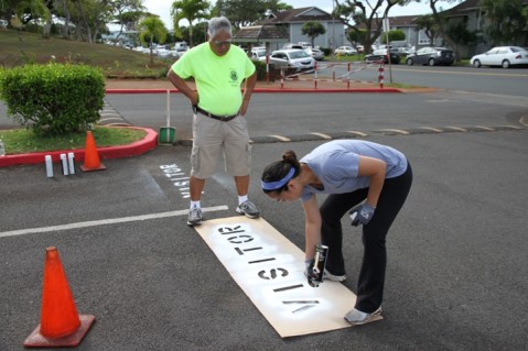 Elizabeth Tang from Keiwit, and Brian Nitta from the Mana Loa-Nimitz Lions Club repaint visitor parking stalls in the Waiau Elementary School parking lot.