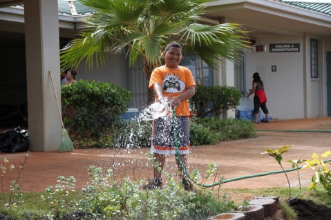 “We were contacted by Leroy Ching from the Pearl City Community Association and he asked if we wanted to participate in Adopt-A-School Day and we said definitely. We see all this participation and we love it! We have people from the Pearl City Community Association, also volunteers from the Lions Club, Pearl City High School, the Key Club and the Pace Project at the high school, and our parents and staff and our students. The main objective was to spruce up the front of the school. So, all of our curbing was painted in red where we don’t want the cars to park. Shrubs were put in the front of the school. The hedges and trees were trimmed. A lot of worked was done in the last couple of hours.