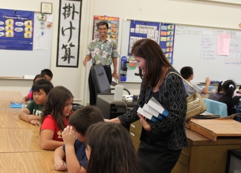 Charlene presents Momilani Elementary School third graders with brand new dictionaries on September 22, 2011 during the Rotary Club of Pearlridge Dictionary 5000 Project that supplies selected Pearl City and Aiea elementary schools with dictionaries for their third grade students.