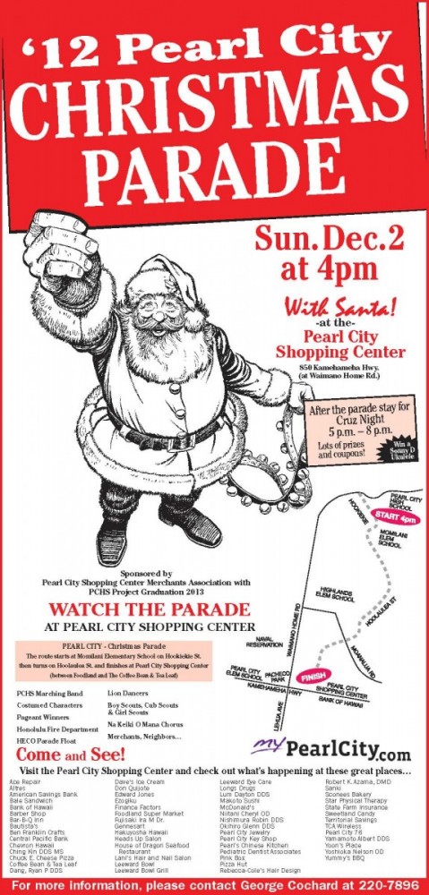 The annual Pearl City Christmas Parade starts at 4:00 p.m., Saturday, December 2nd ending at Pearl City Shopping Center. The parade route will begin at Momilani Elementary School on Hookekie Street, turning on to Hoolaulea Street, finishing at Pearl City Shopping Center. Come to the parade and see the Pearl City High School band, 2013 Miss Hawaii USA, 2013 Miss Hawaii Teen USA, Girl Scouts, costumed characters, Boy Scouts and Cub Scouts, local car clubs, merchants, and more! PLUS, after the parade watch the awards ceremony for best Marching Group and Best Float trophy to be given by Santa Claus in front of Bank of Hawaii.
