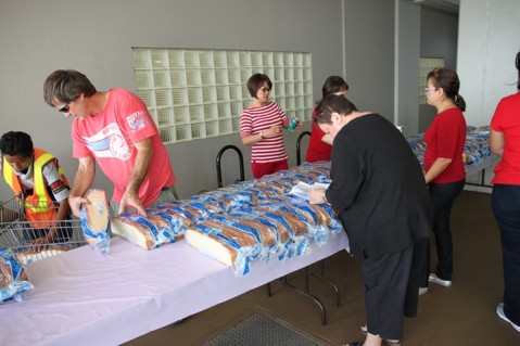 Corporate office staff members load up 26 loaves of Punaluu Sweetbread for PCSC tenant Bar-B-Q Inn.