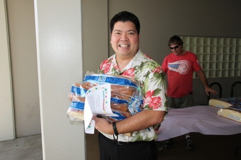Finance Factors, Pearl City Branch Manager, Shawn Taniguchi is all set to head back to his office with a few loaves of sweetbread for his staff.