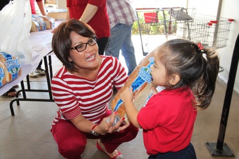 Angie hands a couple of loaves of sweetbread to a little helper from the MyPearlCity.com office located at the Pearl City Shopping Center.