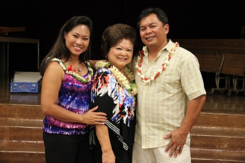 Hawaii Ballroom Dancing Association instructors Patty Dela Cruz (left ) and husband Mark Dela Cruz take a photo with Shirley Ota.