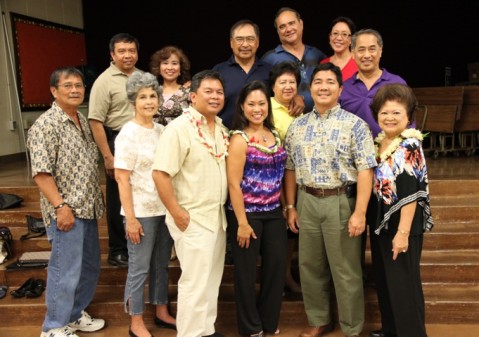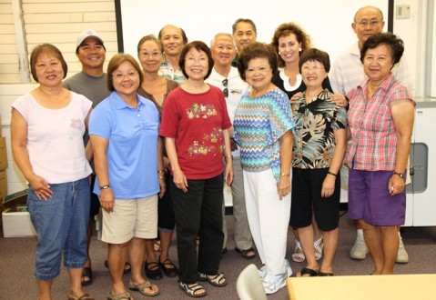Members of the Pearl City Chapter and Beta Chapter of the Hawaii Ballroom Dancing Association pose for a photo at the Manana Elementary School cafeteria.