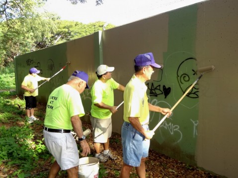 Community volunteers from the Pearl City Lions Club and Mana Loa-Nimitz Lions Club joined forces on Saturday, April 6, 2013 to paint over graffiti during the Annual Pearl Harbor Bike Path Clean Up.