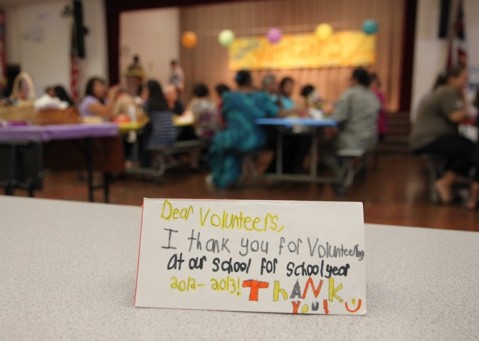 Lehua Elementary School held their annual Lehua Volunteer Appreciation Breakfast on Friday, May 3 in the school cafeteria. Volunteers who donated their time to help out the school with various projects throughout the current school year were invited to enjoy a very generous Buffett breakfast and also to receive an appreciation certificate from the school administration and student body. Each volunteer also received a beautiful thank you card designed by the students.
