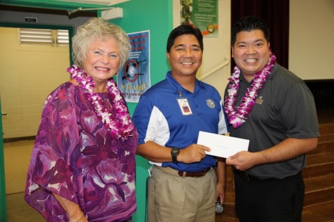 Representatives from the Pearl City Shopping Center (PCSC) Merchants Association presented Manana Elementary School Principal Mr. Bryan Loo with a donation of 10 – $100.00 PCSC gift certificates during a welcome back to school assembly held this morning in the school cafeteria.
