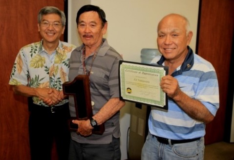 PCCA President Warren Hiromoto along with Honolulu City Council member Breene Harimoto, presented Nishimura with a certificate of appreciation during the PCCA Board of Directors monthly meeting held at the Pearl City Shopping Center conference room.