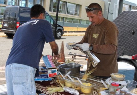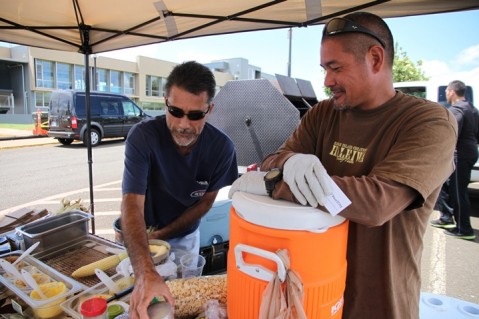 Keoni prepares another flavored ear of corn for a happy customer as Chef Kele looks on.