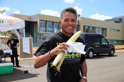 Charlie from the Happy Heifer Hawaiian Greek Yogurt booth is ready to enjoy Na'Ono Fresh Roasted Corn.
