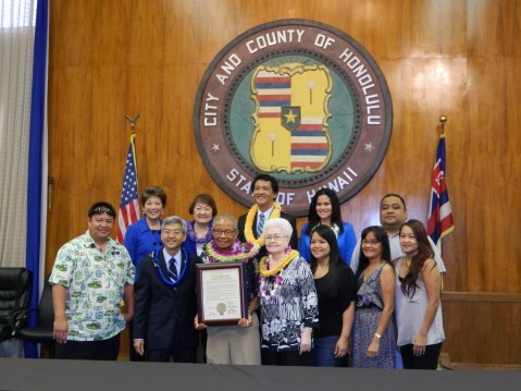Harimoto (left) along with Honolulu City Council members (L-R, back row) Carol Fukunaga, Ann Kobayashi,