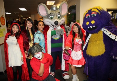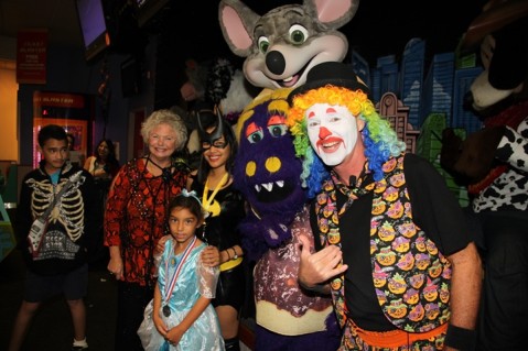 Several of the Chuck E. Cheese team members pose for a photo with Chuck E. Cheese himself!