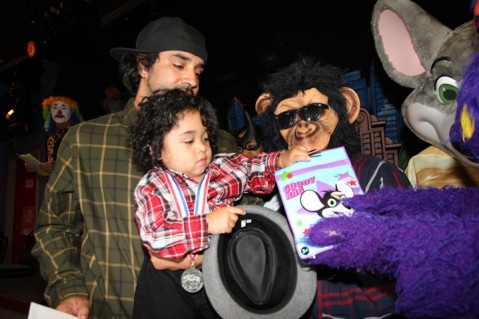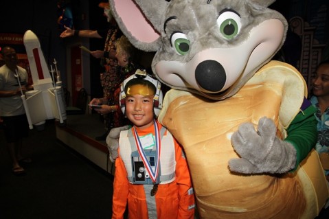 This high flying astronaut pictured with Chuck E. Cheese is set to blast off after picking up his prize.
