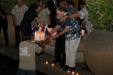 Last night, Thanksgiving Eve, a traditional Japanese floating lantern ceremony was held inside the pools that flow around the state capitol. The event was coordinated by State Senators Donna Mercado-Kim and Glenn Mukai. It was a very emotional ceremony as families of the victims sent off their prayers upon the waters and into the light that leads upon tomorrow and into the afterlife.
