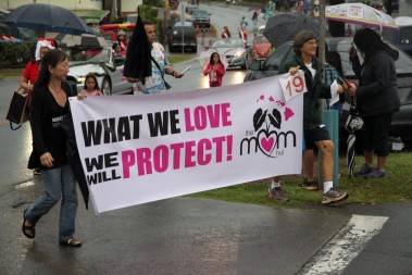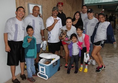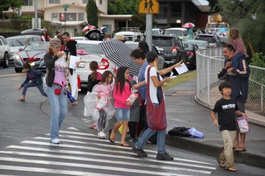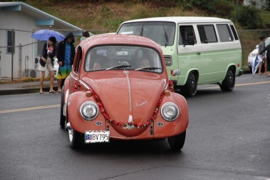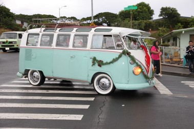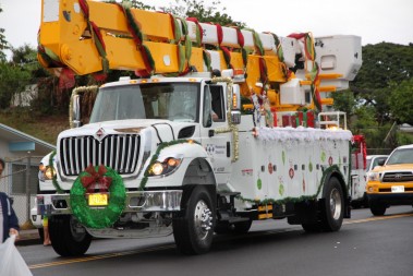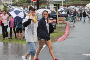 “I’m so proud of our parade goers. Our parade folks are dedicated and they’ve been in the rain, and have marched through sun and thick clouds of water. Today we’re just really proud for the ones who hung through this whole thing. The ones who did, I think had a great time. It’s just such a wonderful thing to see young kids growing up with a sense of responsibility to the community and we are thankful for that. Thanks to the Pearl City Shopping Center Merchants Association for sponsoring this fabulous time. Also thanks to the Pearl City High School Project Grad, they’re the ones out there in the rain making sure the whole parade came together. We would to thank all the folks at McDonald’s, Annette and her team have provided sandwiches for everybody who was in the parade after that long, wet, winding road down from Momilani Elementary. Even though Pearl City Highlands Elementary School who organized the food drive, was unable to participate, several people along the route brought out food to donate to Hawaii Foodbank. Marchers picked the donations up along the way and placed them in the HECO truck following the fabulous HECO float. Thanks to the Honolulu Police Department, every year they’re out there keeping us safe.” …Sheri Rolf, Rolf Advertising