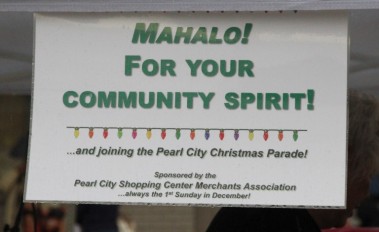 Mahalo to all the participants and residents who braved the rain to be a part of this year's Pearl City Christmas Parade sponsored by the Pearl City Shopping Center Merchants Association. Also, thank you to the Pearl City Shopping Center Merchants Association for their generous support of the parade which included Pearl City Shopping Center gift certificates and trophies for the groups that placed in the Marching and Floats Divisions. Also, for their donation of $1000 to support Pearl City High School's Project Graduation program.