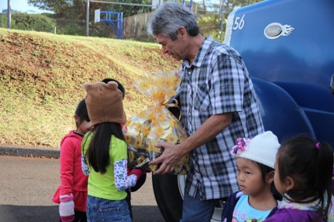 Mr. Santos receives a gift basket from Momilani students in appreciation for his generous donation.