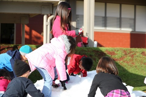 Twelve tons of snow dropped on the Momilani Elementary School campus grounds Monday morning much to the delight of the school's student body and just in time for the annual "Snow Day". Grades K-6 got the opportunity to put on their winter clothes and climb and play on the massive mound of snow.