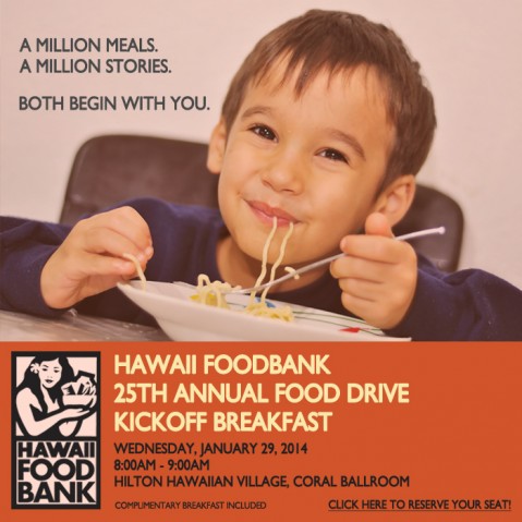 The Hawaii Foodbank announces its Annual Food Drive Kick-Off Breakfast scheduled for Wednesday, January 29, 2014 at the Hilton Hawaiian Village Coral Ballroom from 8:00am – 9:00am. Please log on to: http://www.hawaiifoodbank.org for more information.
