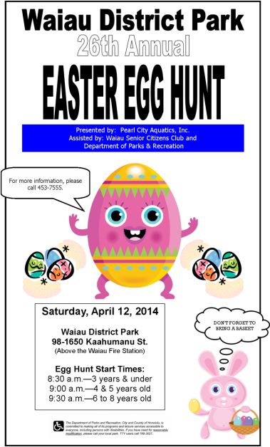 Pearl City Aquatics, Inc. will present the Annual Waiau District Park Easter Egg Hunt this Saturday, April 12 beginning at 8:30am at Waiau District Park.
