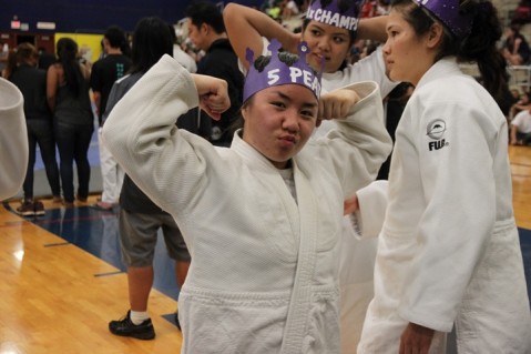 Netanya Kang flexes with pride during the Pearl City Lady Chargers post OIA Girls Team Judo