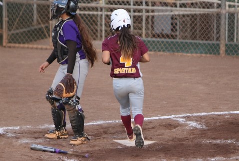 Miki Takara scores the Lady Spartans first run in the bottom of fifth inning.