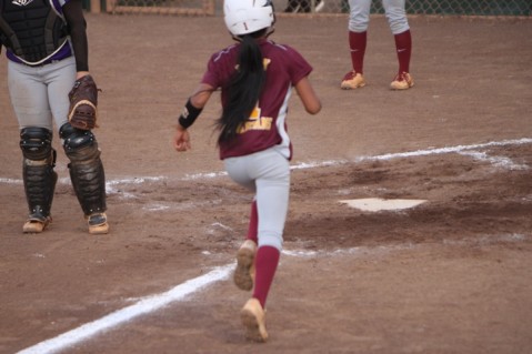 Tamia Hirano scores the final run of the ball game on Bree Soma's three RBI triple..