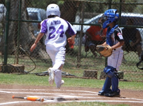 Gavin Ainoa is pictured scoring the first run of the ball game from third base in