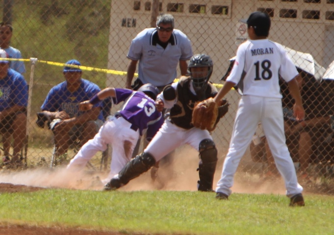 Brandon Sarae slides safely past Waipio catcher Seth Garcia at home plate