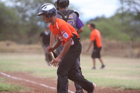 Shayden Yip makes the turn at third base and would score Pearl City's