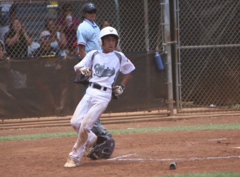 Waipio's Kaysen Kajiwara scores from third base on Matt Aribal's RBI single in the bottom of the third inning.