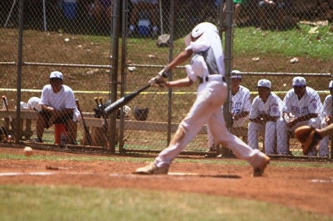 Waipio's Kaysen Kajiwara is pictured hitting an infield grounder that scored