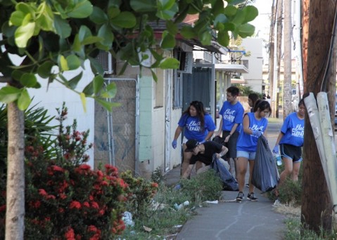 Student community volunteers make their way up Lehua Avenue towards Kamehamenha Highway.
