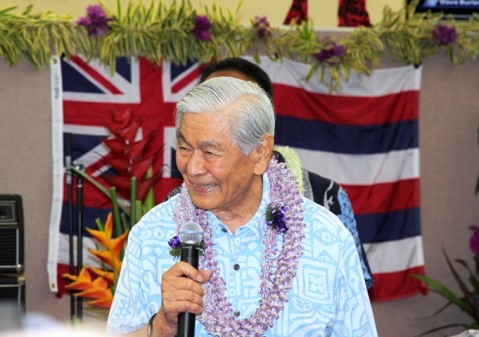 Former Hawaii Governor George Ariyoshi is pictured speaking to Ige supporters last night